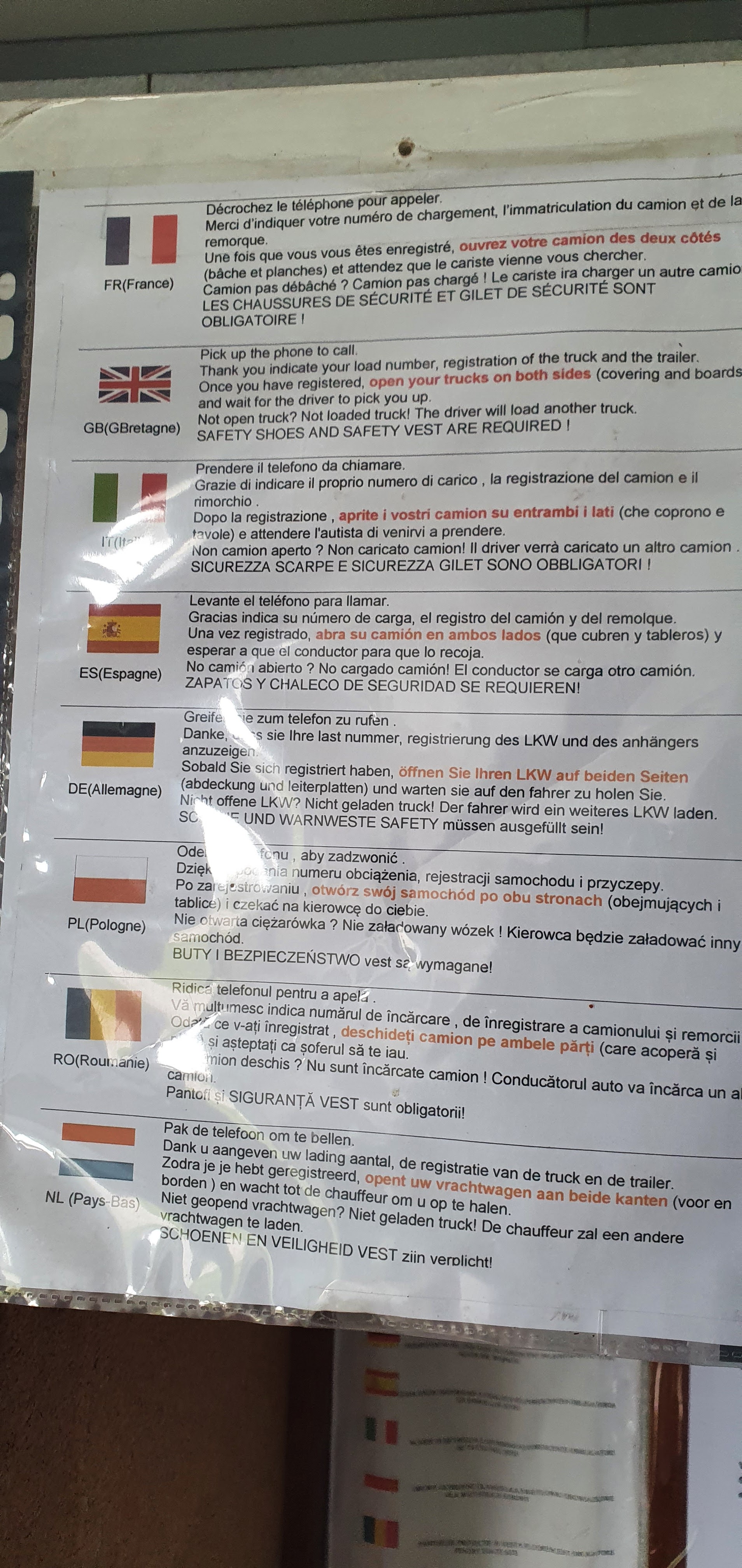 Parking devant l'entreprise, toilettes, douche pour chauffeurs. Enregistrement par téléphone, le changement qui m'est arrivé, le gars du bureau parlait anglais, celui en fauteuil roulant le parlait un peu moins bien, mais il le parlait aussi. Dans le parking, vous devez ouvrir les deux côtés, sinon le chariot ne vous appellera pas pour le charger. Ils chargent des deux côtés des bouteilles en verre. Temps d'attente sur le parking environ 1h30, chargement 25 minutes. Globalement positif.